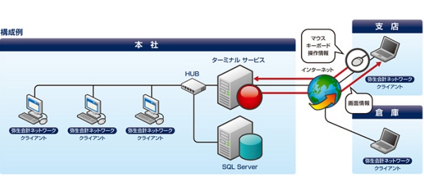 遠隔事業所も含めたWAN 運用では、ターミナル サービス※を活用したネットワーク構成にすることで、弥生アプリケーションはサーバーへのインストールのみで済み、メンテナンスが容易で運用コストの低減も図れます。