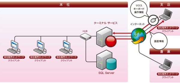 遠隔事業所も含めたWAN 運用では、ターミナル サービス※を活用したネットワーク構成にすることで、弥生アプリケーションはサーバーへのインストールのみで済み、メンテナンスが容易で運用コストの低減も図れます。